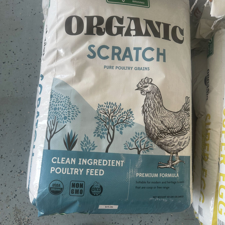 Organic poultry scratch feed with a balanced grain blend for healthy pecking.